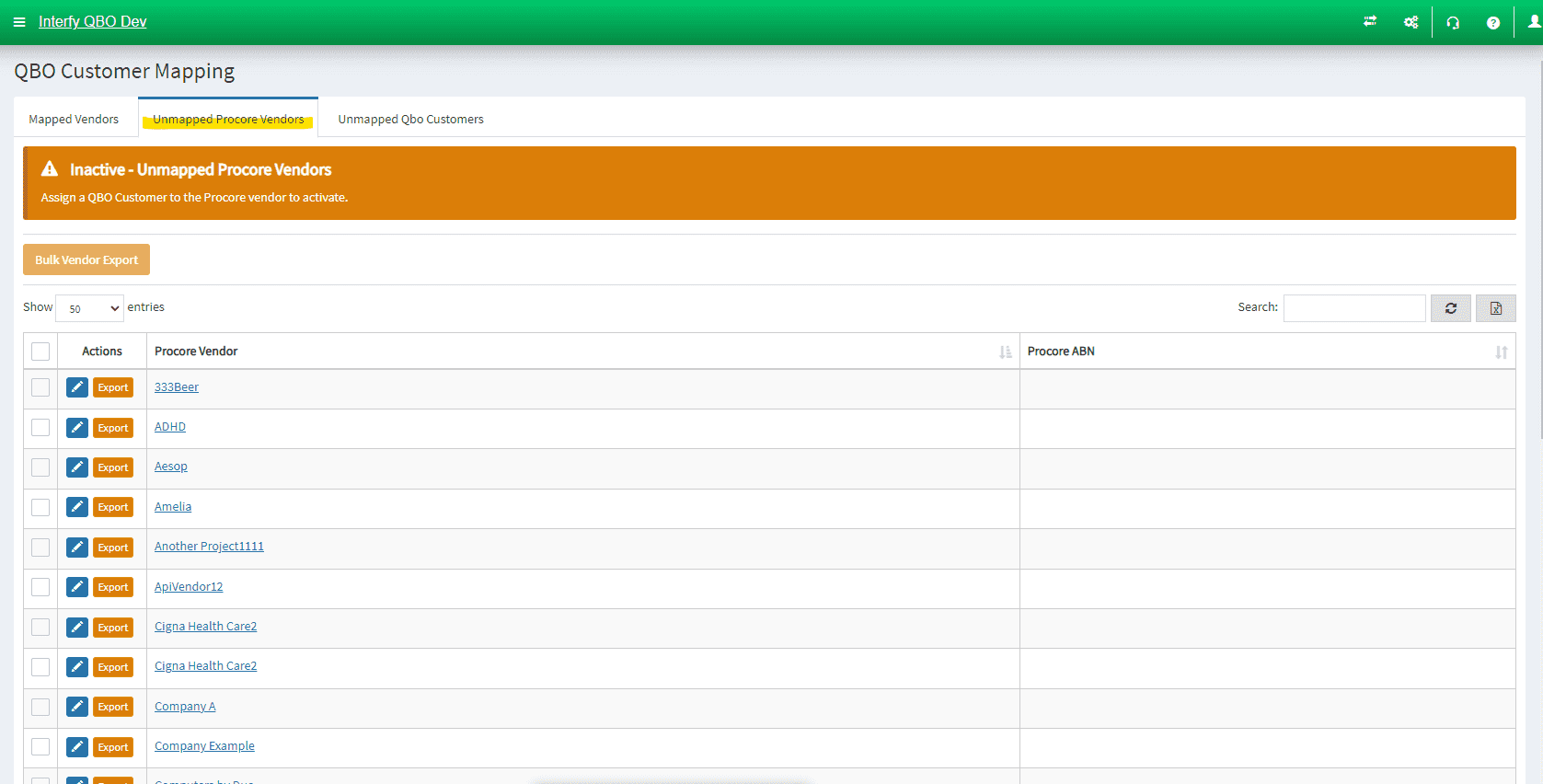 4. You will see three tabs – Mapped Vendors, Unmapped Procore Vendors and Unmapped QBO Vendors.