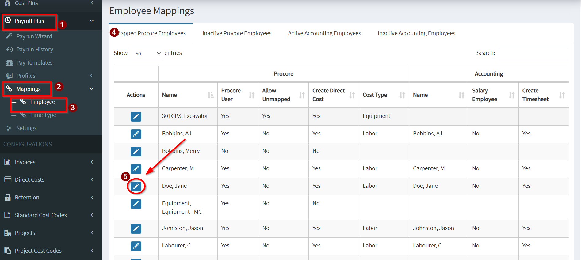 2. Navigate to Mappings > Employee. Click on the pencil icon in the Employee Mappings table.