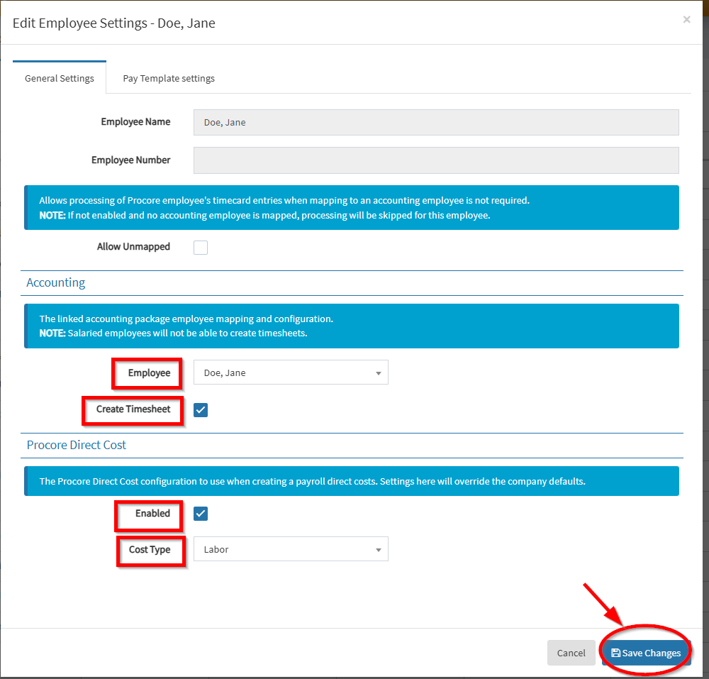 - Enabled: To enable Procore Payroll Direct Cost creation