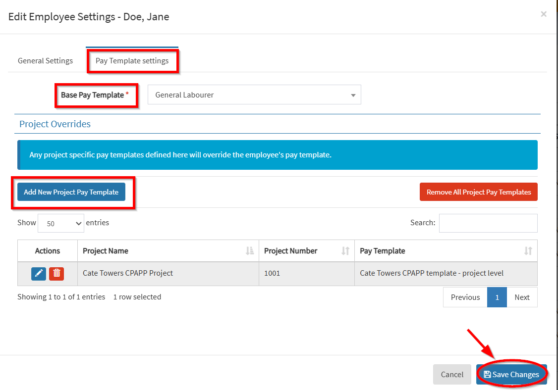 - Add new Project Pay Template/s – Any project specific pay templates defined here will override the employee’s pay template.
