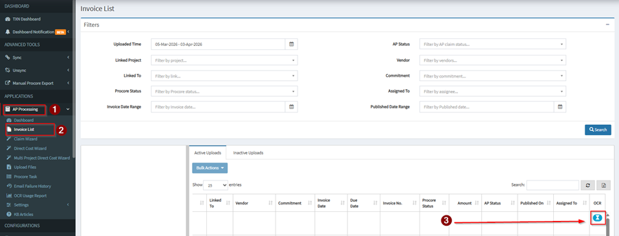 If Automatic OCR is disabled, it will only be processed after you initiate it manually using this button beside the invoice that you uploaded.