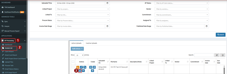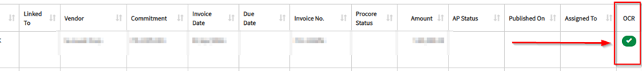 OCR will scan and populate the columns Linked Project, Vendor, Commitment/Order Number, Invoice Date and Invoice Number.
