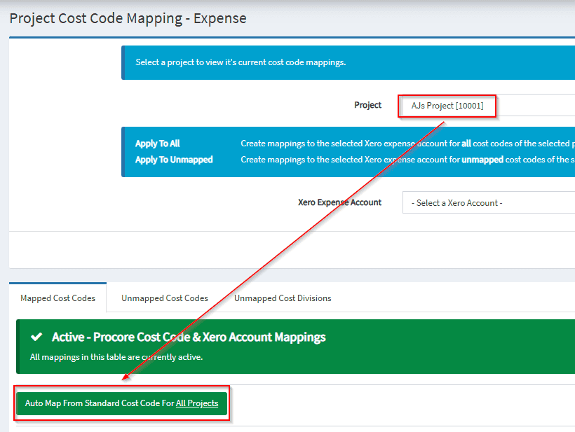 2. Select the relevant project from the Project drop-down menu and select the Mapped Cost Codes tab.