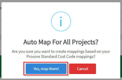 4. Click Yes to auto-map the cost codes. Once mapped the cost codes will appear under the Mapped Cost Codes tab.