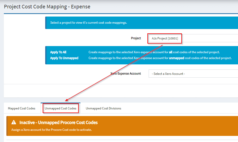 4. If the project cost codes are not created from the standard cost codes, they will need to be manually mapped. Select the Unmapped Cost Codes tab.