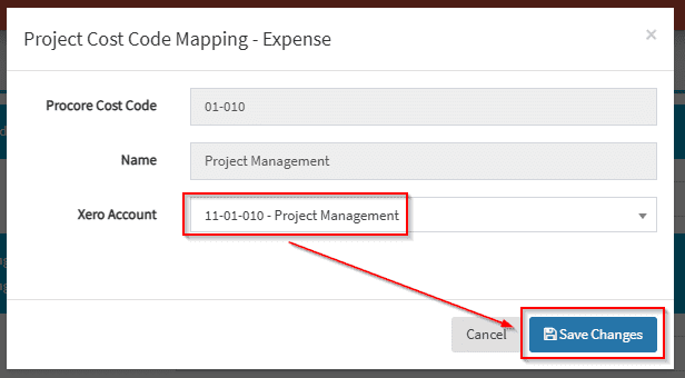 6. Select the Xero account to map the cost code to. Click on save changes.