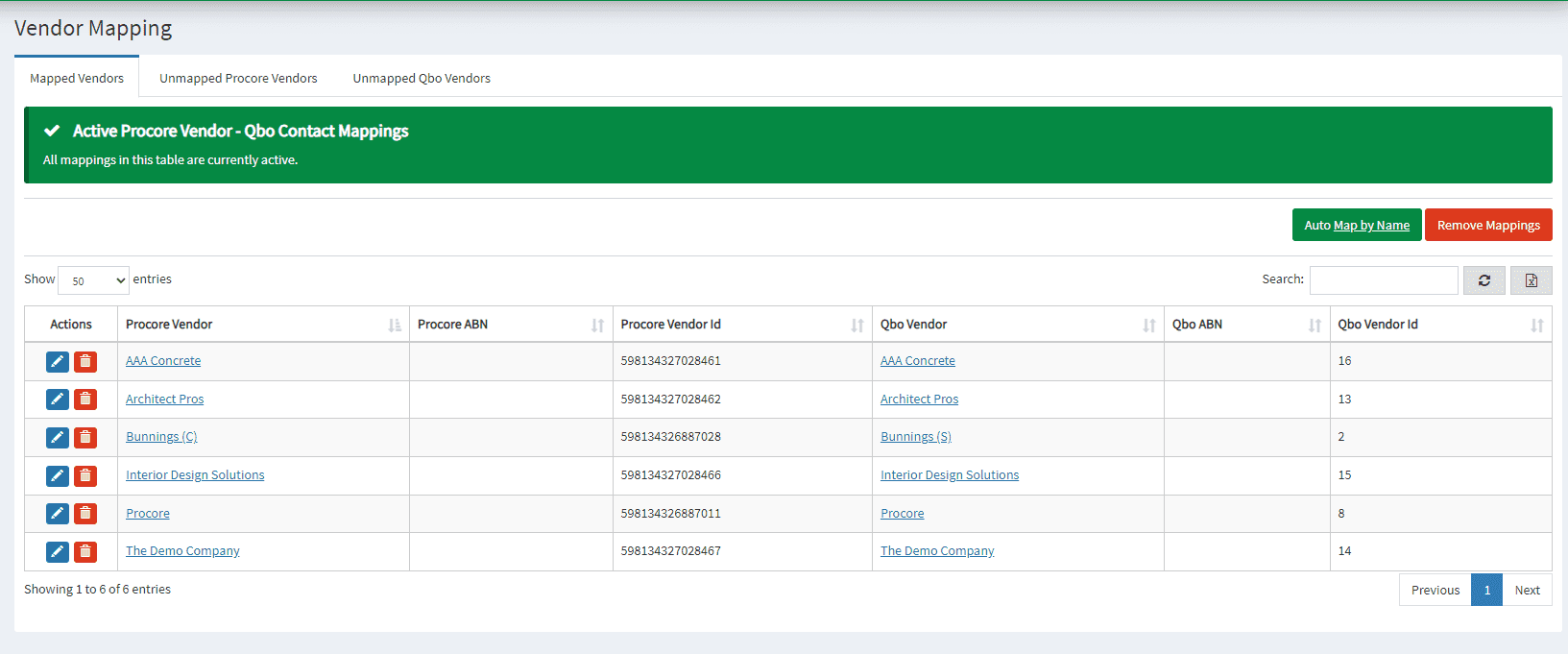 4. Navigate back to Mapped Vendors, you will see the selected Procore Vendor is established.