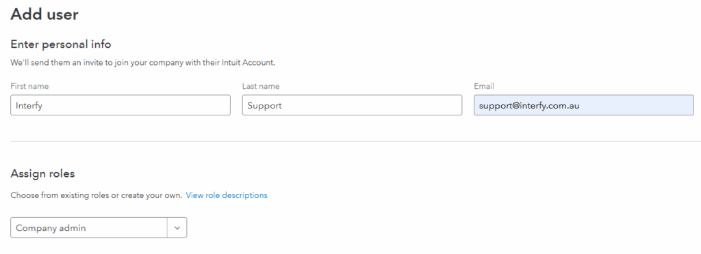 - Please create a new User in your QBO instance named OneCore Connect Support (First Name Interfy, Last name Support) with the email address: support@interfy.com.au