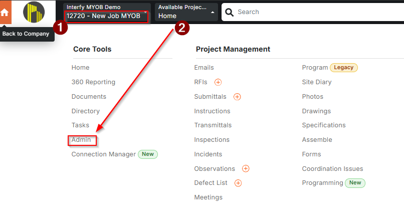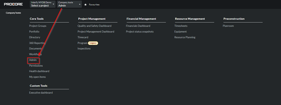Once you have enabled multi-currency at the company level you can then enable multi-currency for each of your Procore projects. Select the relevant project in Procore and then navigate to Admin under your Company Tools menu.