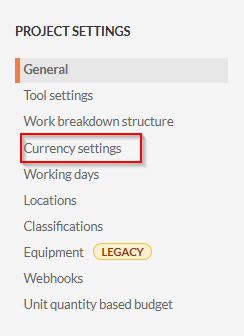 Under the Project Settings menu on the right-hand side of the screen select the Currency settings option.