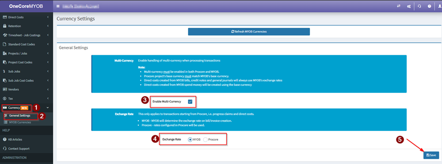 In OneCore you will need to ensure Multi-currency is enabled. You can do this by navigating to Currency>General Settings> and then checking the Enable Multi-Currency tick box. You will also need to ensure you have selected which platform you’d like to handle the exchange rates. Please note that Procore uses a static rate that you will need to set and update from your end, and MYOB uses a live exchange rate from (if enabled).