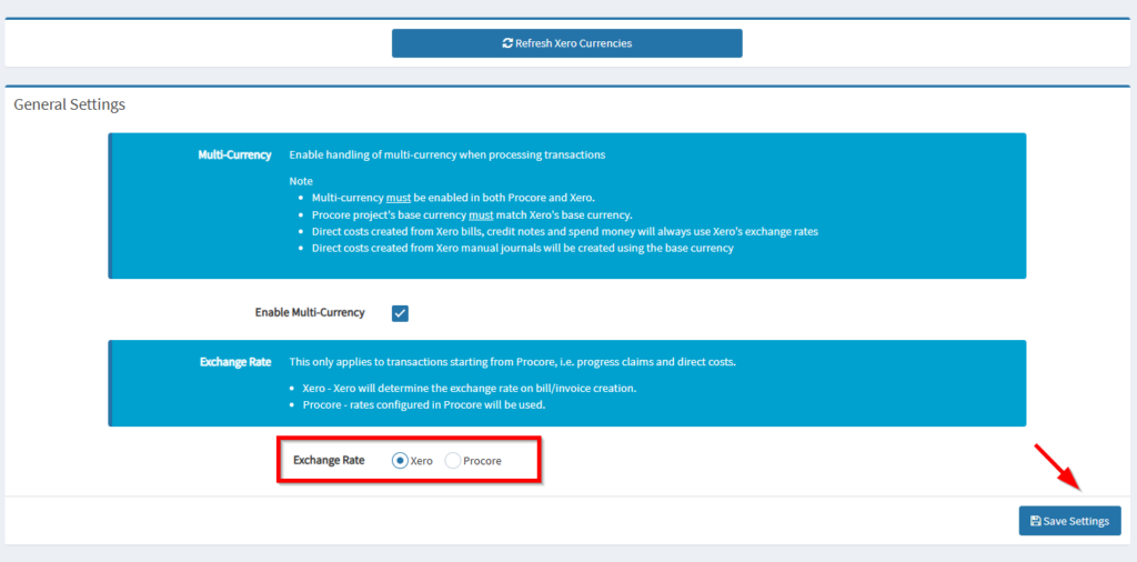 In OneCore you will need to ensure Multi-currency is enabled. You can do this by navigating to Currency>General Settings> and then checking the Enable Multi-Currency tick box. You will also need to ensure you have selected which platform you’d like to handle the exchange rates. Please note that Procore uses a static rate that you will need to set and update from your end, and Xero uses a live rate from XE.com.