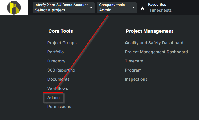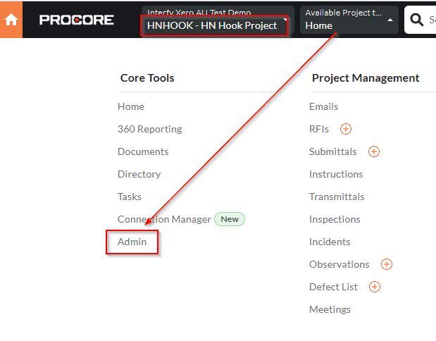 Once you have enabled multi-currency at the company level you can then enable multi-currency for each of your Procore projects. Select the relevant project in Procore and then navigate to Admin under your Company Tools menu.