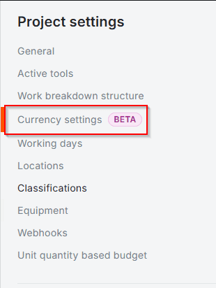 Under the Project Settings menu on the right-hand side of the screen select the Currency settings option.