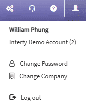 The top header bar shows the logged in user from the top-right corner. When clicking on the logged in user you have the option to Change Password, Change Company or Logout: