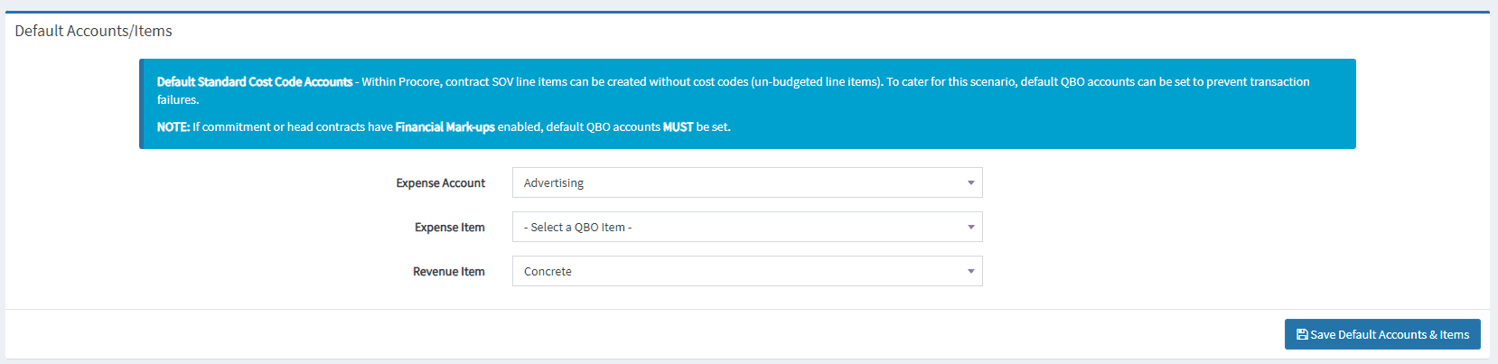 Within Procore, contract SOV line items can be created without cost codes (un-budgeted line items). To cater for this scenario, default Odoo accounts can be set to prevent transaction failures.