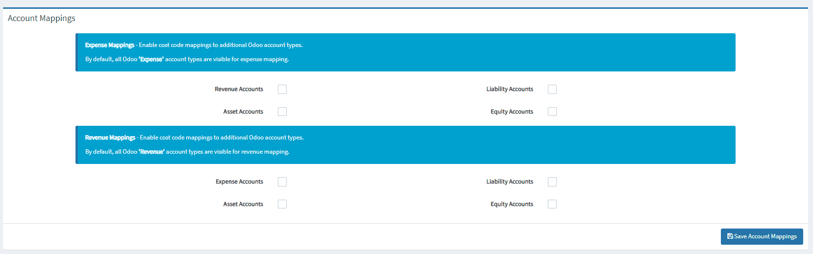 Toggle cost code mappings to additional in the Odoo account types: