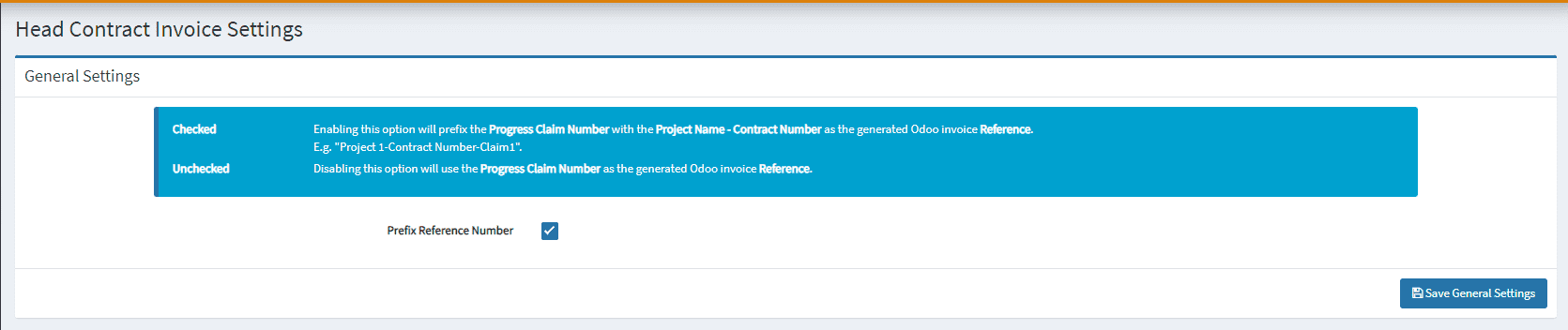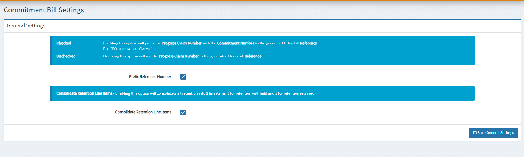 - Prefix Commitment Number: Set the prefix of Progress Claim Number with the Commitment Number upon generating Odoo Bill’s Reference Number