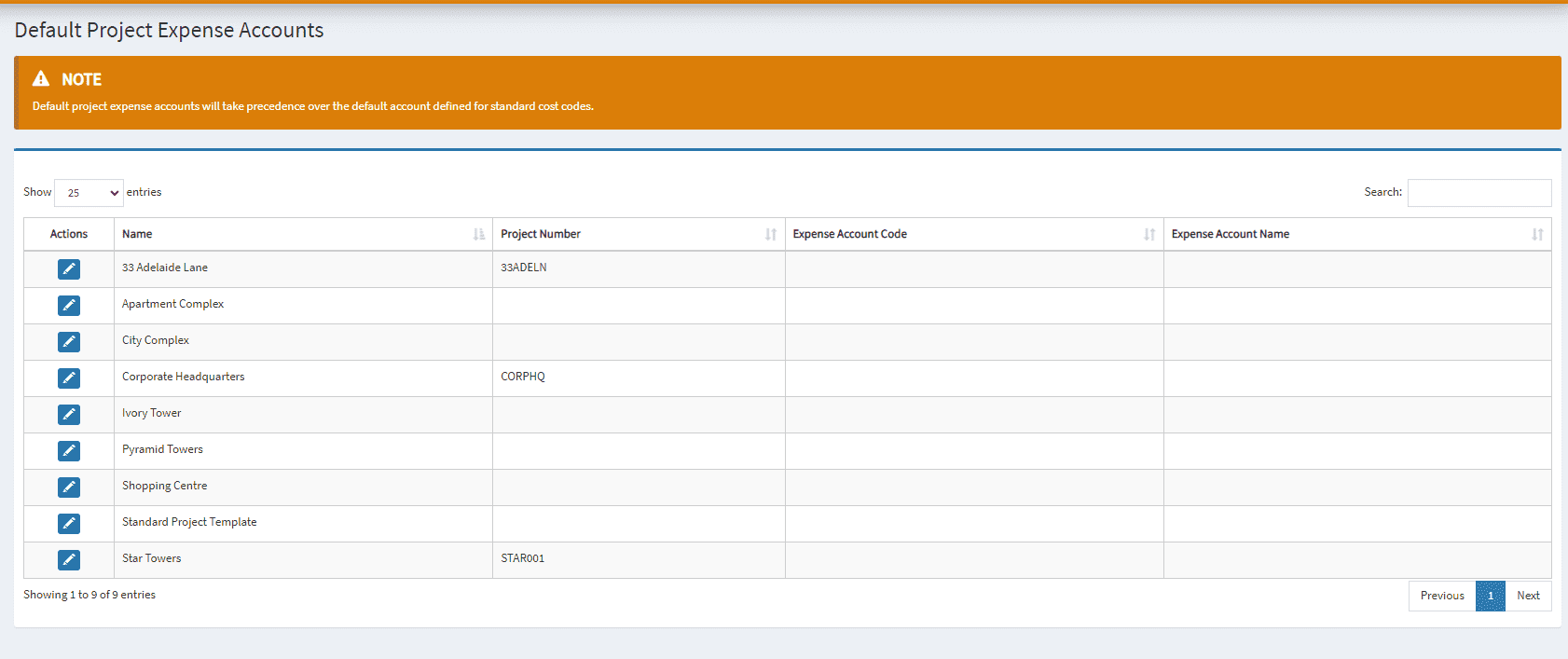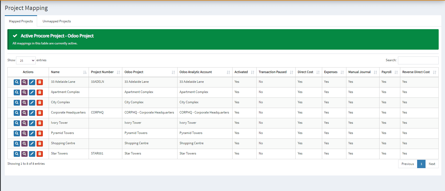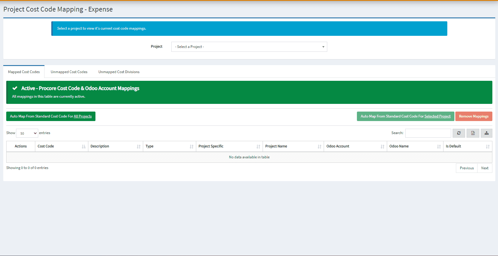 - Select a project to view it’s current cost code mappings