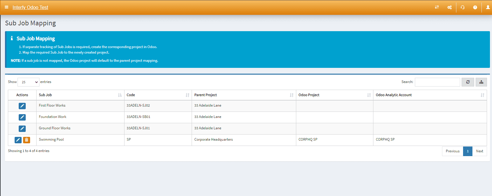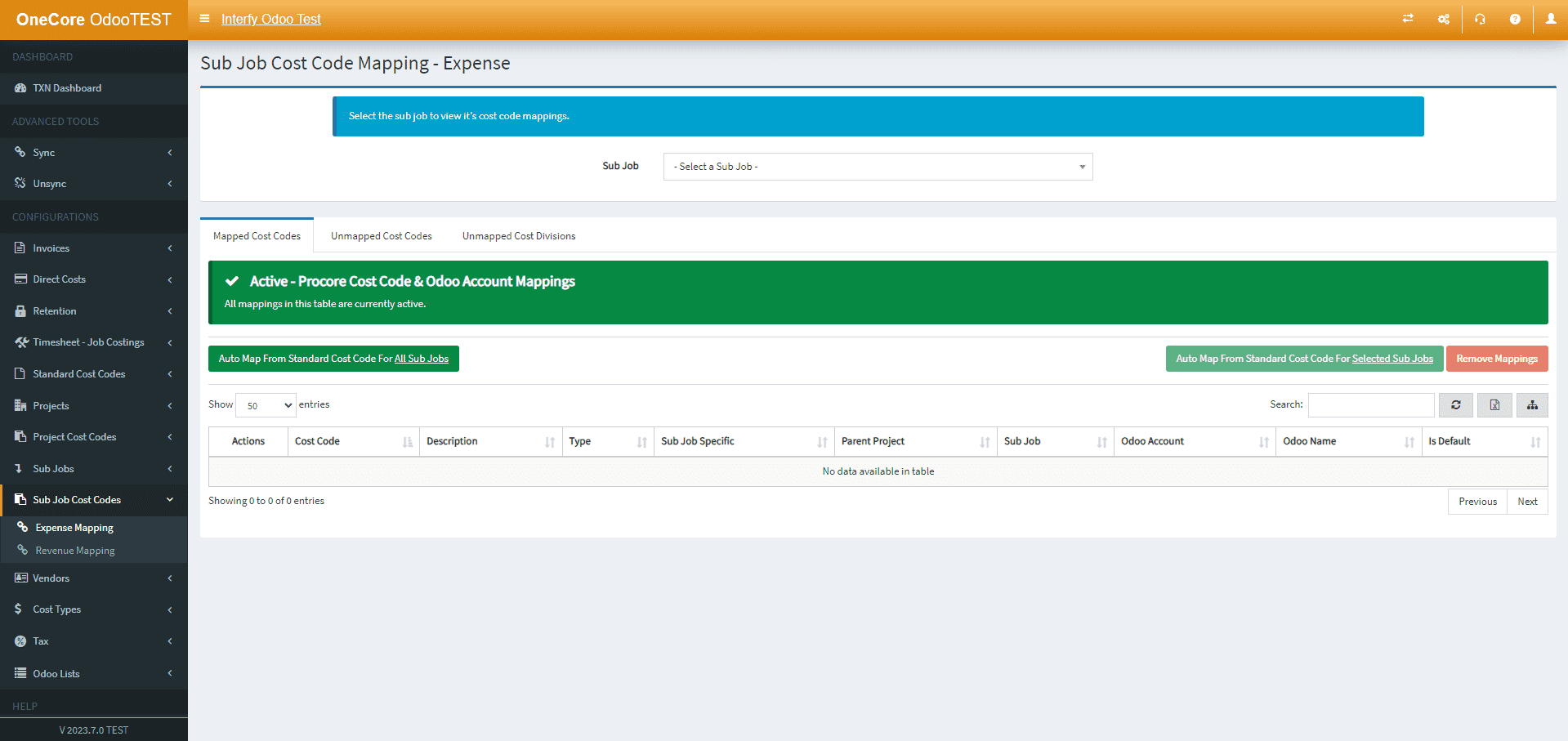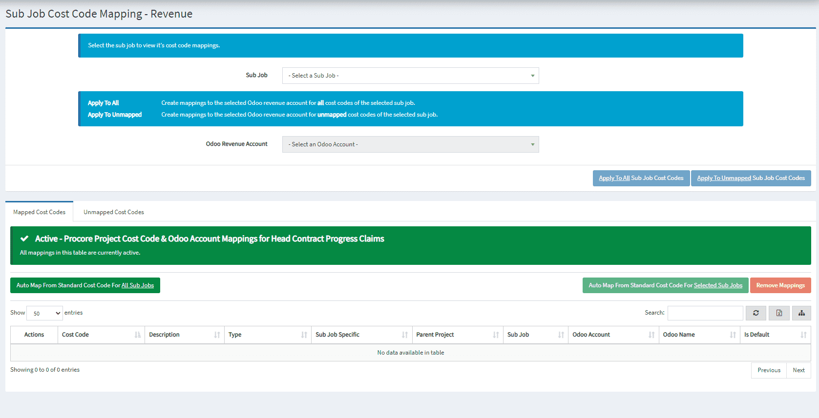 - Apply to Unmapped: Apply Odoo Expense Account to all unmapped Sub Job Cost Codes
