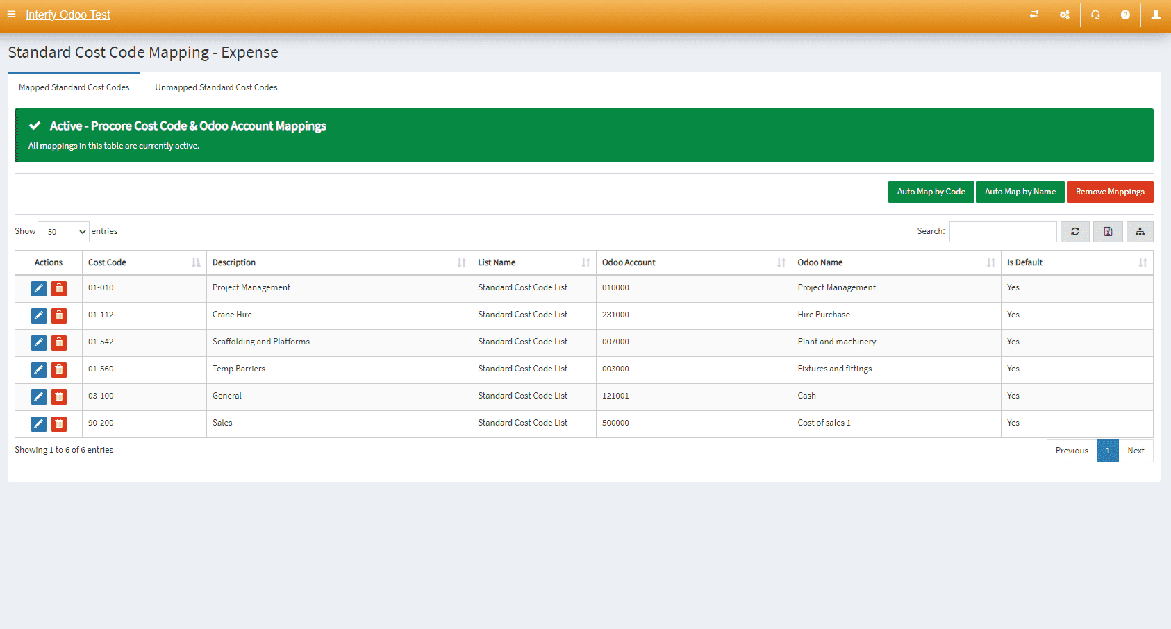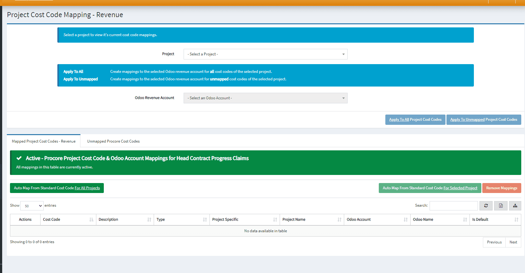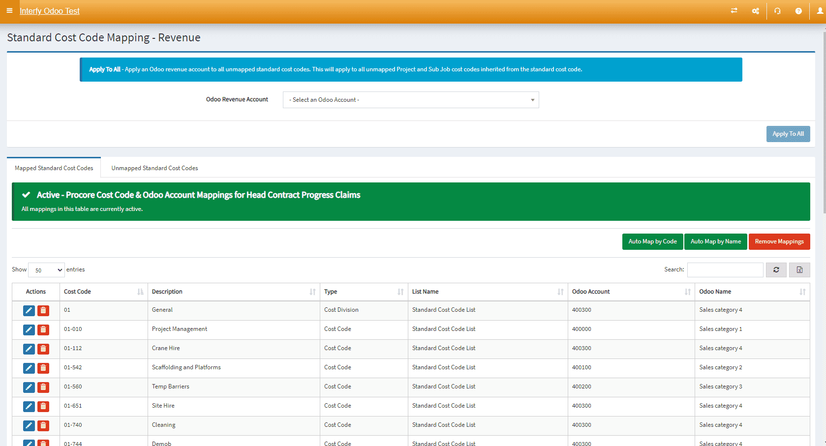 - Mapped Cost Codes: Active mappings