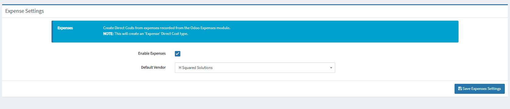 - Default Vendor: Set the default vendor for Direct Cost when processing expenses from Odoo