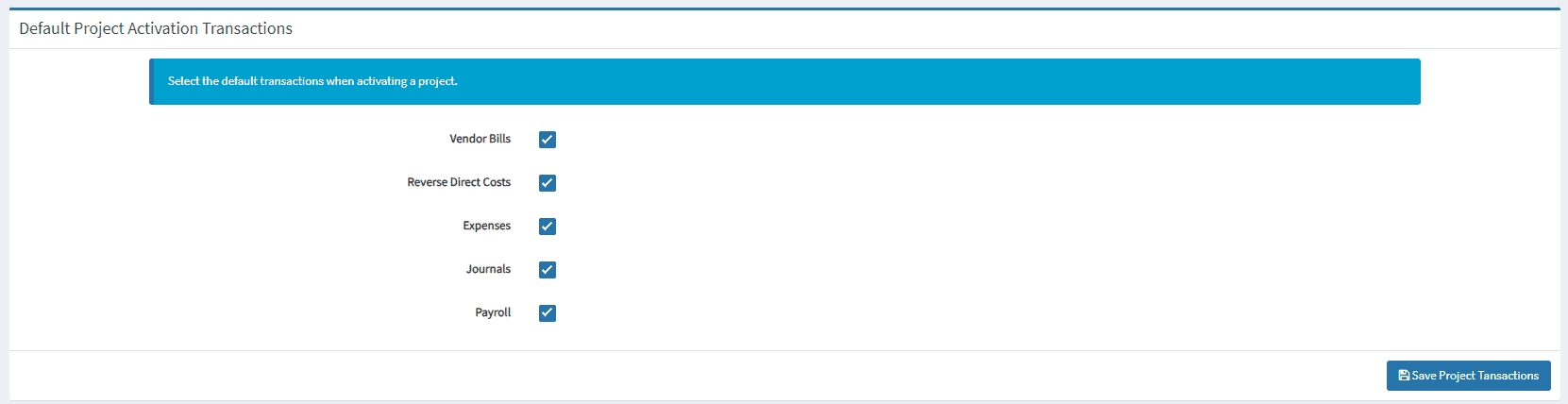 - Set the default transactions when activating a project