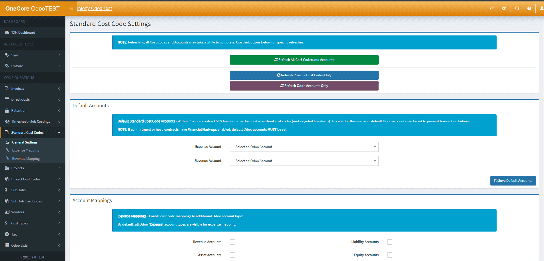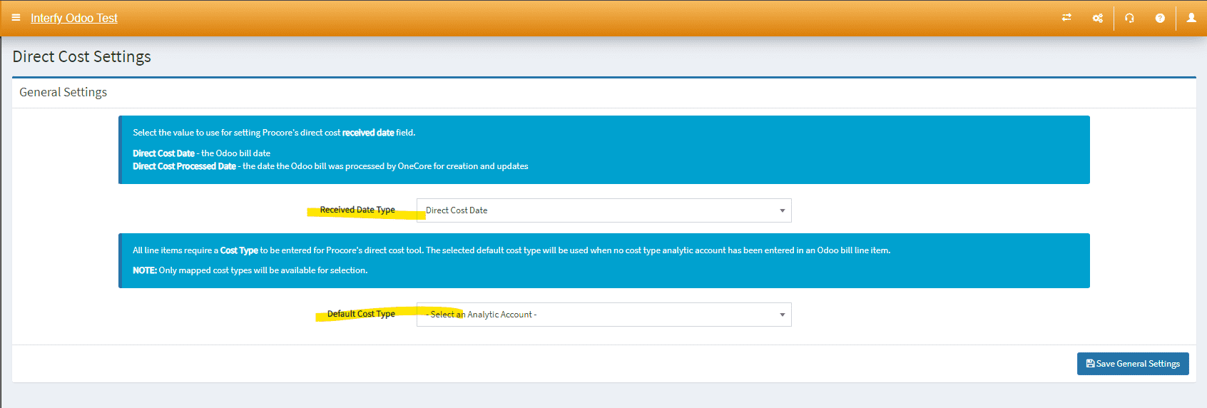 General Settings allows you to update the Procore cost code and Odoo account lists in OneCore, as well as set a default expense and revenue account for unbudgeted line items for commitments and head contracts within Procore.