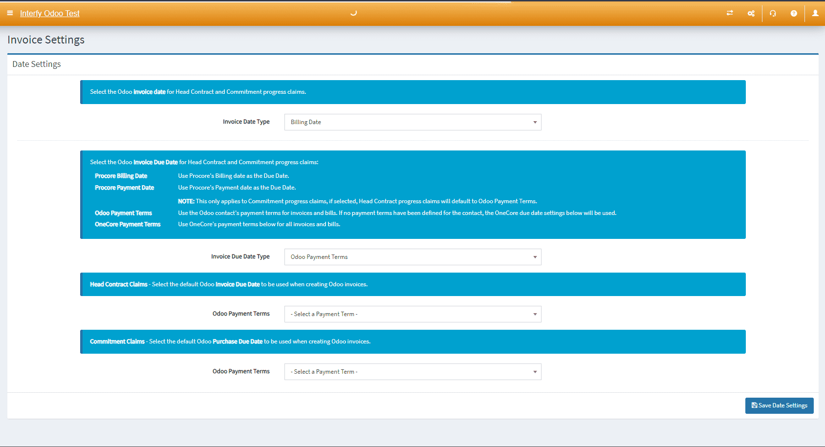 - Invoice Date Type: Set Odoo invoice date for Head Contract and Commitment progress claims