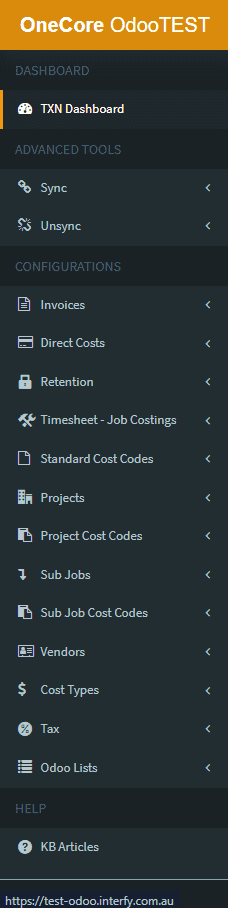 The left pane menu allows you to view and set up your company’s integration settings between Procore and Odoo. The menu options include: