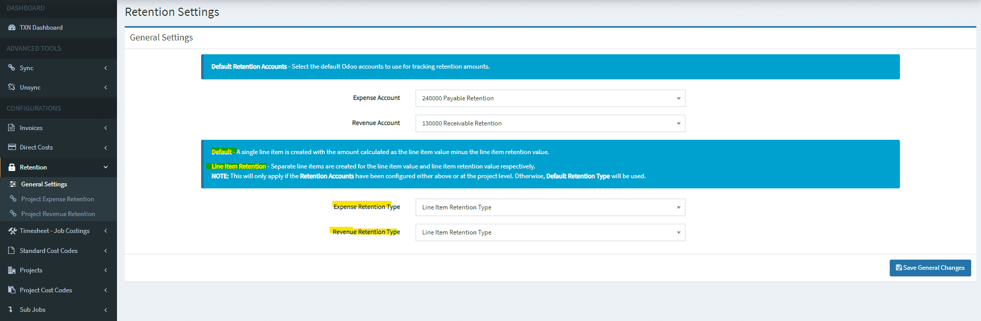General Settings allows you to select your default retention expense and revenue accounts, if you use it, as well as setting the default retention type.