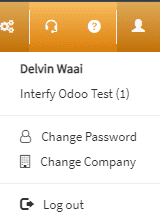 The top header bar shows the logged in user from the top-right corner. When clicking on the logged in user you have the option to Change Password or Logout: