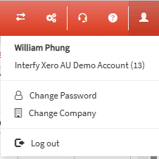 The top header bar shows the logged in user from the top-right corner. When clicking on the logged in user you have the option to Change Password, Change Company or Logout: