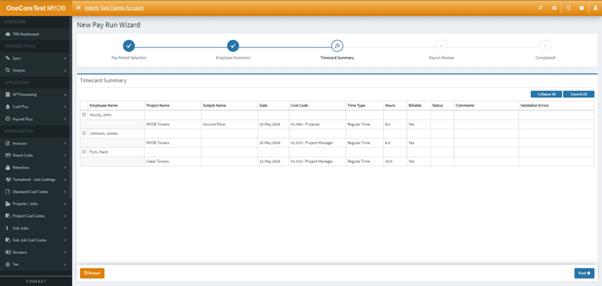 After payrun reviews, the system will populate the processed data into Procore and MYOB