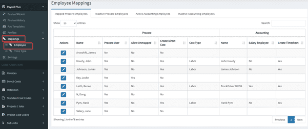 - Mapped Procore Employees – This tab displays a list of Procore employees/workers pulled in from Procore