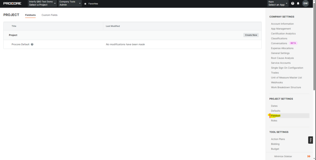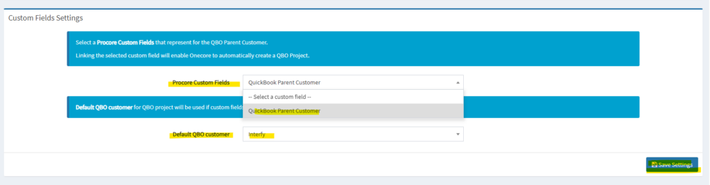 Default QBO Customer: If a custom field in the Procore project is not set, we will use the default from here.