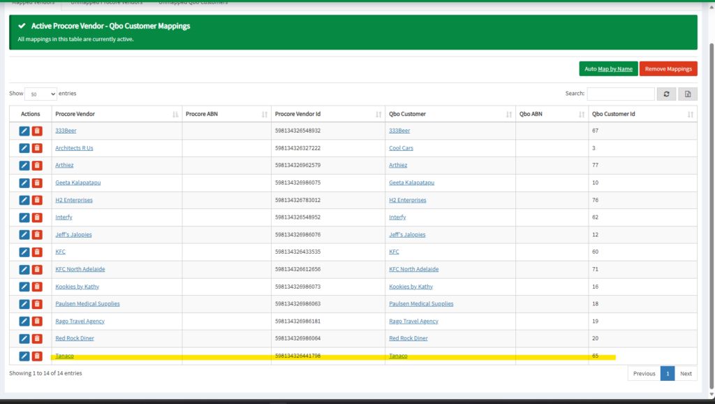 2. Make sure your customer is properly mapped. In the picture below, I have the Procore Vendor (Tanaco) mapped to QBO Customer (Tanaco)