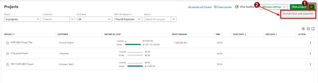 To convert a QBO sub-customer to a QBO Project: