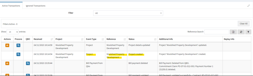 10. In the Dashboard table, you should see the Project-created transaction being processed.