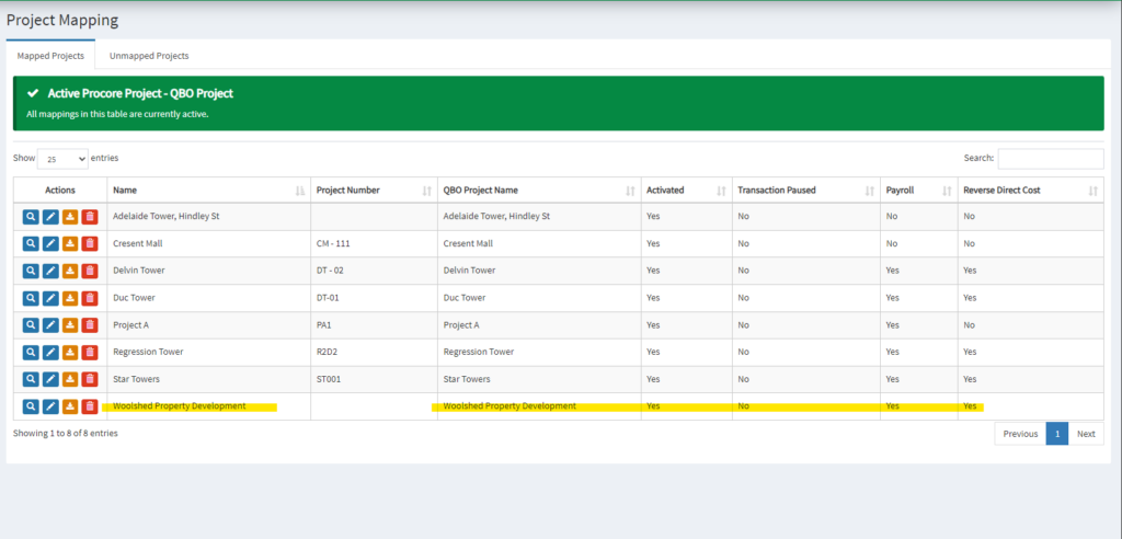12. In Project Mapping, you can see the record in the table, with all the statuses being configured by OneCore.