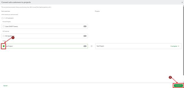 3. You can then select the current sub-customers that you want to convert to a QBO Project and click Convert. Please note that this is a one-time conversion that you can do at any time. QBO then will move all the linked transactions with it.
