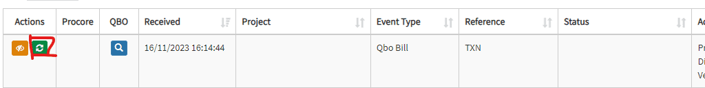 5. Click the replay green button under actions to retrigger the transaction and it will sync with QBO/Procore.