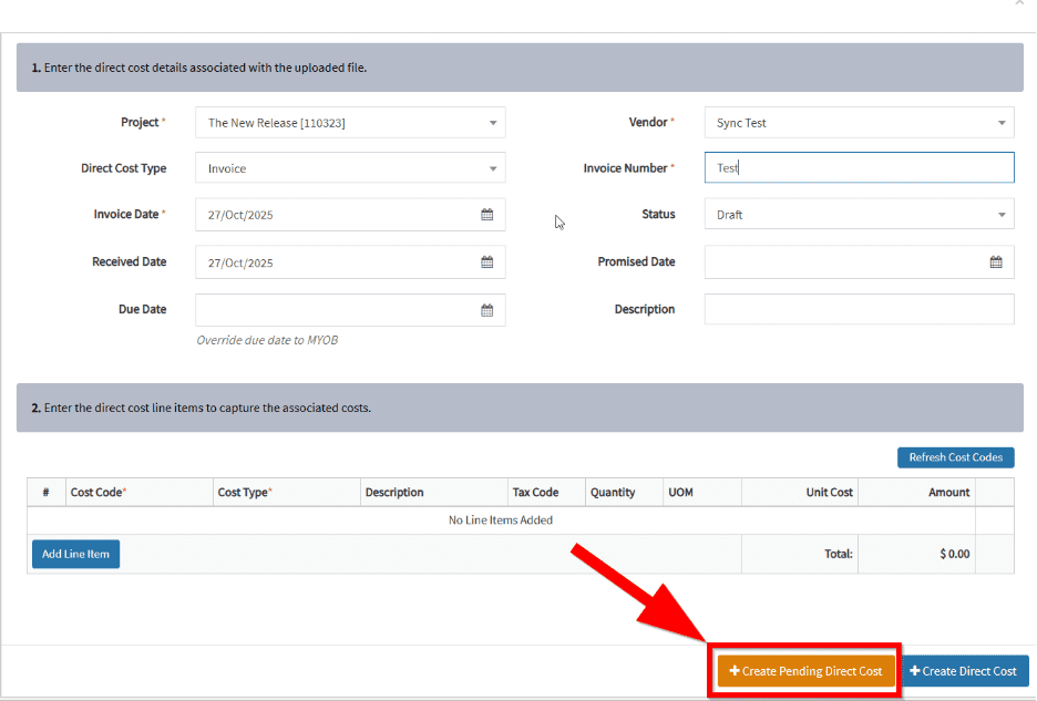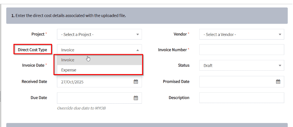 - Ability To Set the Procore Direct Cost Type on Creation – Allows selecting ‘Invoice’ or ‘Expense’ type direct cost.
