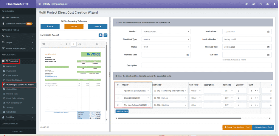 - Multi Project Direct Cost – Allows processing an invoice to multiple projects