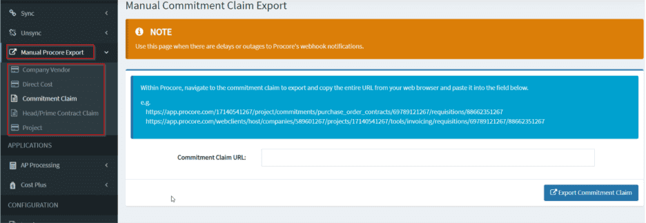 - Manual Exports (for when Procore hooks are down) – Use this page when there are delays or outages to Procore’s webhook notifications.