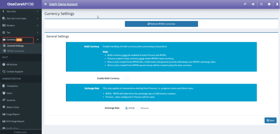 - Project Level Transaction Toggles – Allows users to enable/disable specific transactions from Procore and MYOB.